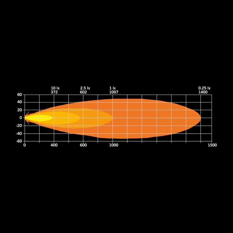 Ovo svjetlo fokusira snagu s iznimno visokom učinkovitošću.2 Postiže nevjerojatan domet od preko 1000 metara (1 lux @ 1007m), dok troši samo 70.0W (10-32V DC). Iako je stvarna svjetlina 4040 lumena, veliki reflektor maksimizira iskoristivost svjetlosti.